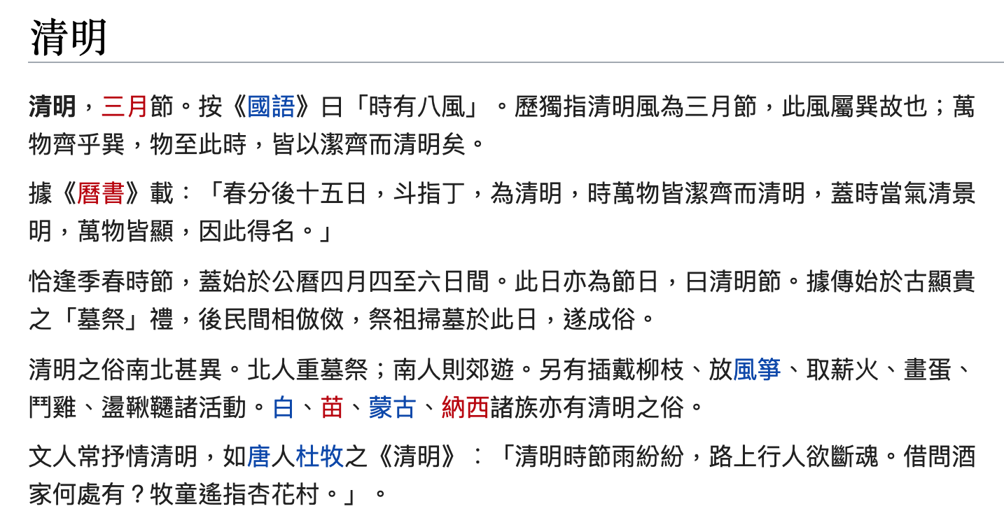 如果要寫和清明有關的文章,又想要引用一些「典故」,你會怎麼做?查網路、查 wikipedia?沒錯,「維基大典」裡就有這麼一條: